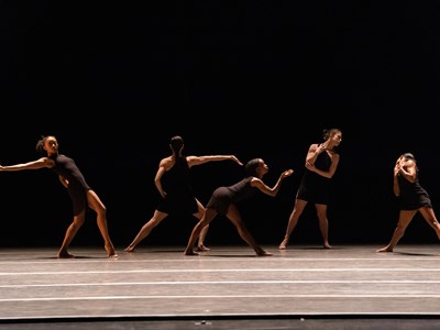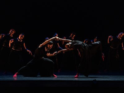 Hubbard Street Dancers Shota Miyoshi and Simone Stevens with the Company in NEVERMORE by Thang Dao.